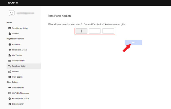 Satın almış olduğunuz PlayStation US Cardnuzu girerek "İleri" butonuna basarak işleminize tamamlayabilirsiniz.